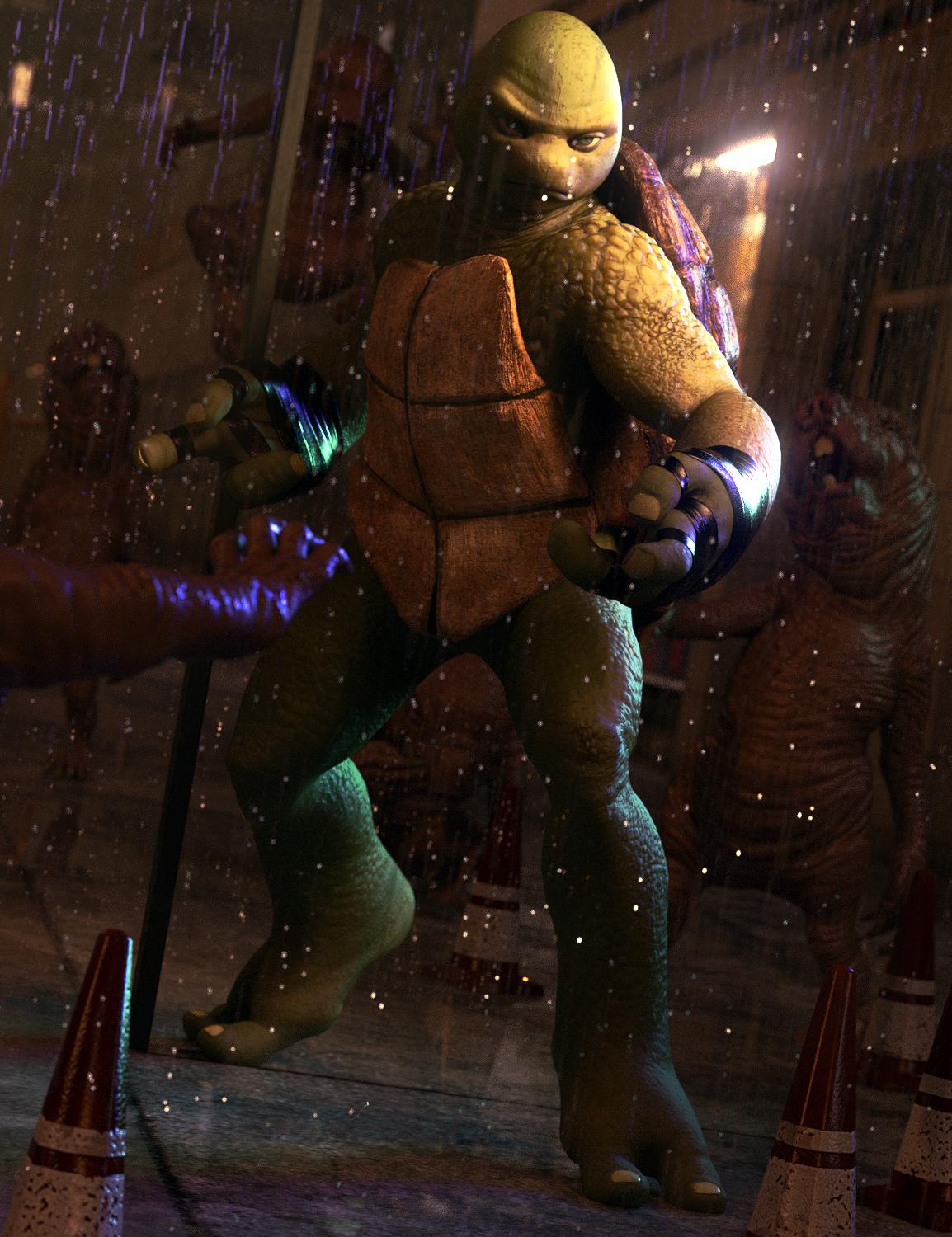 In the base package you get the Turtle FBM, a conforming shell, eye textures, and wet and try body mats.  There is also a projection morph included for fitting clothing over the shell.  Between commercial projects I'm chipping away at some turtle specific accessories and textures.  I hope to be able to share those soon.