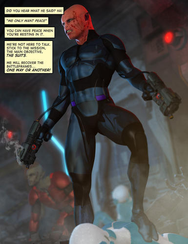 I was looking at supersuit troopers- great set of sci-fi shaders by the way, and these two bits of promo art caught my eye, even if the product itself looks a bit plain, the artists did a nice job with perspective and characters.