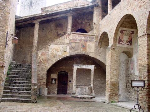There's a place just outside where you can see all the towers. Up in the town is a beautful church with frescoes, a well in the main place and a lovely town hall - with it's own tower. Last time I went to see the frescoes by Benito Gozzoli on the life of St Augustine in the old Domenican convent and then up the town hall tower. Out the back of the town hall is a small courtyard with a well and family crests. Sometime I will make the courtyard as it is a lovely place.