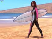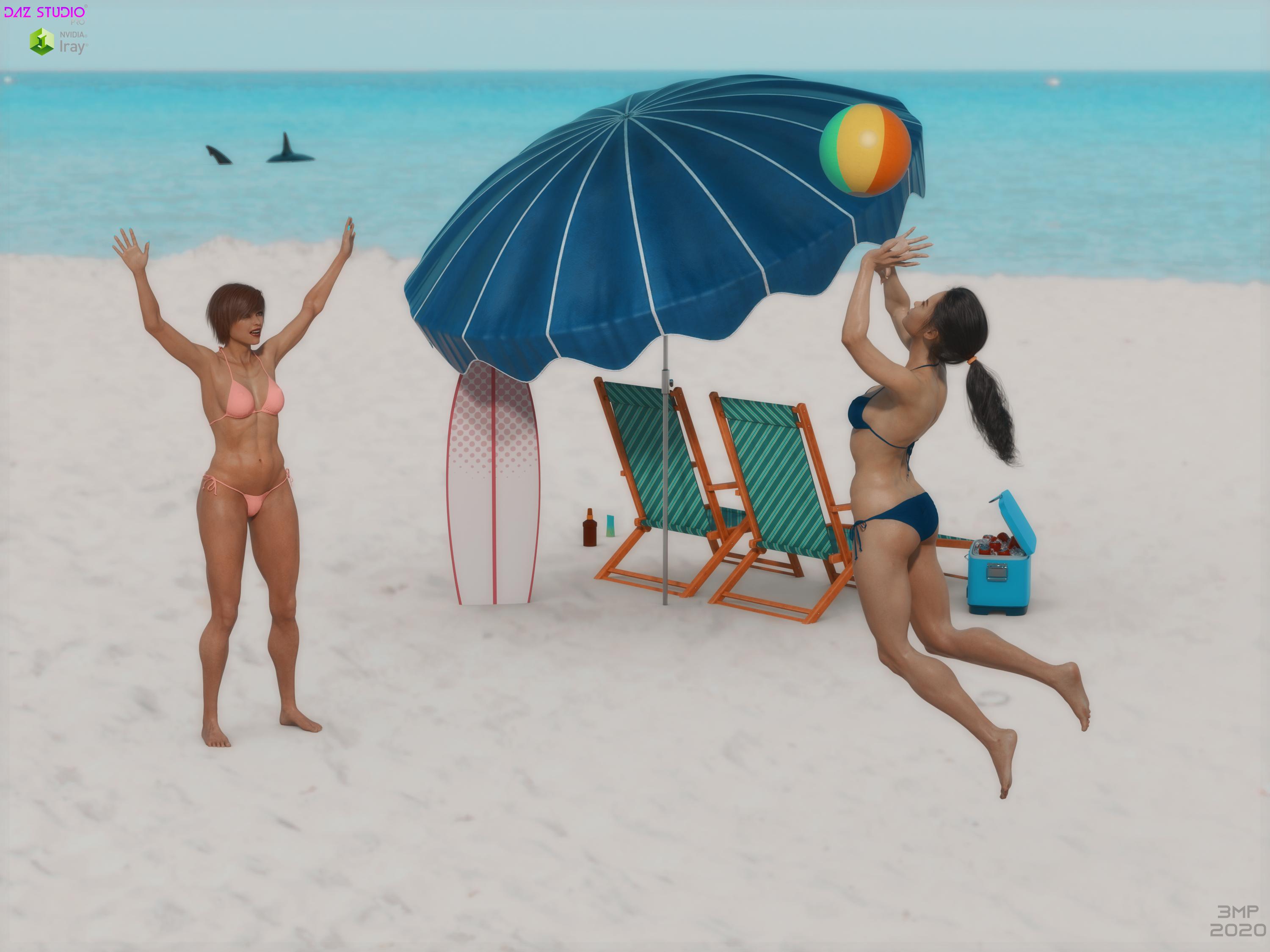 Miah (scene left) and Mila (scene right) at the beach having fun, but there seems to be a big fish lurking.