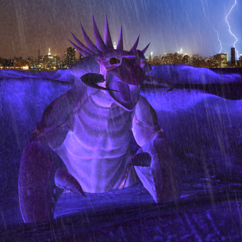 Used UltrueViolet Light set and normal maps on the Kaiju and the water. Tried the glowing shader but it tends to lose detail (and I'm probably doing it wrong anyways :red: ) Added a background and used Rons Rain.