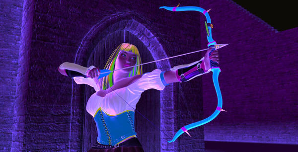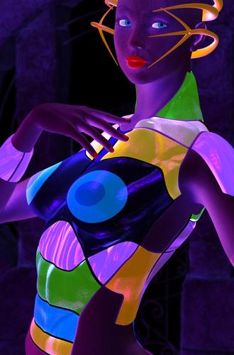 I keep finding new uses and quick ways to "blacklight" previous scenes with the Ultrueviolet light and shaders. This render shows what the lights look like on default V5 Bree skin. No post work has been done.