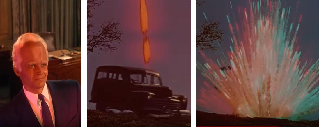 Donning my nerd hat for a moment, actually, it was Exeter's mercurial assistant, Brack, who blasted the Woodie (a type of car for anyone snickering) and it was Steve Carlson (played by Russell Johnson, the "Professor" of Gilligan's Island") who was driving, diverting the attention of the Metalunians from Cal Meachum and Ruth Adams.