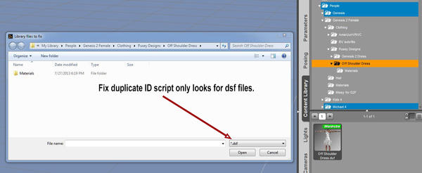 Wendy, thanks for the G2F dress. I've downloaded it and I'm trying to use it. I've run into a trouble. I get a duplicate ID error when I load the "Off shoulder Dress.duf". I ran the script that you referenced in the readme, but it only looks for dsf files, and yours is a duf file. Am I doing something wrong? I am using DS 4.6.0.18. Thanks.