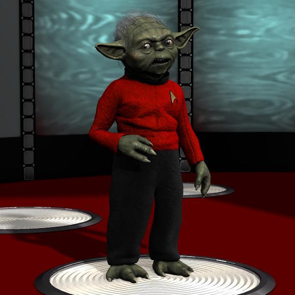 I noticed the body/clothes beneath the robes of the Wartech Yoda resembled a simple "pullover" and slacks, so it was an easy matter to alter their shaders. I did assign a new "collar" material zone so i could shade it black. Slap a Starfleet chevron upon his left pectoral and "Bob's yer uncle!"