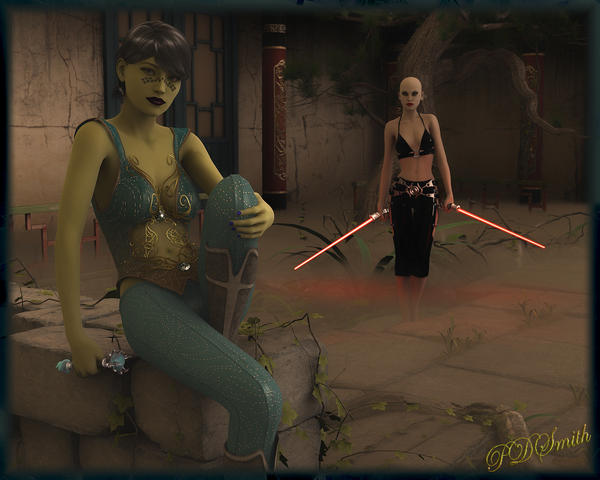 Well, I've tackled Star Trek in the past so I thought I'd try my hand at a Star Wars render. Mr. Turtle seems to lend himself well to being a Jedi what with the Star Wars universe being full of interesting creatures so I gave him a lightsaber and put him against a sith and a feline femme fatale.