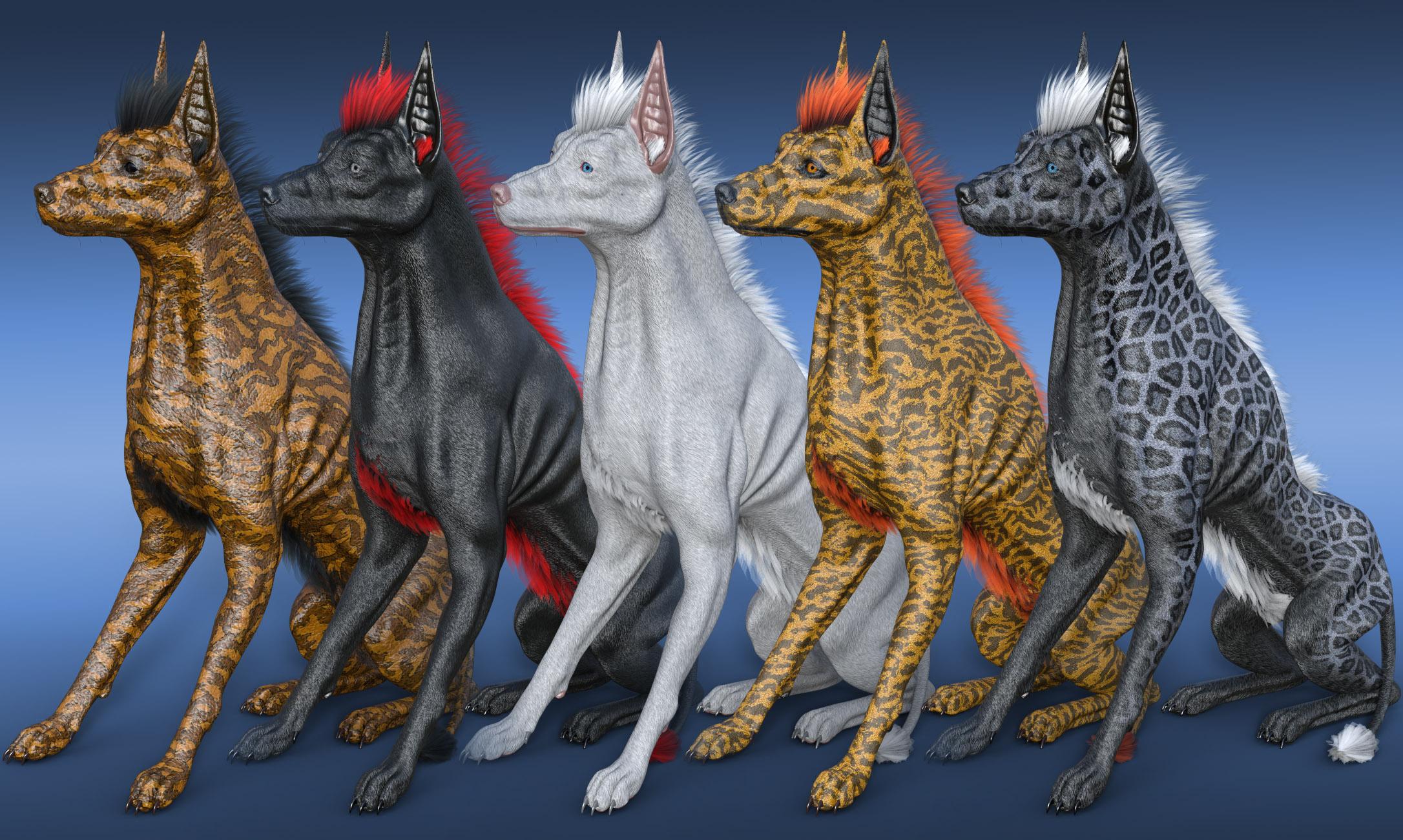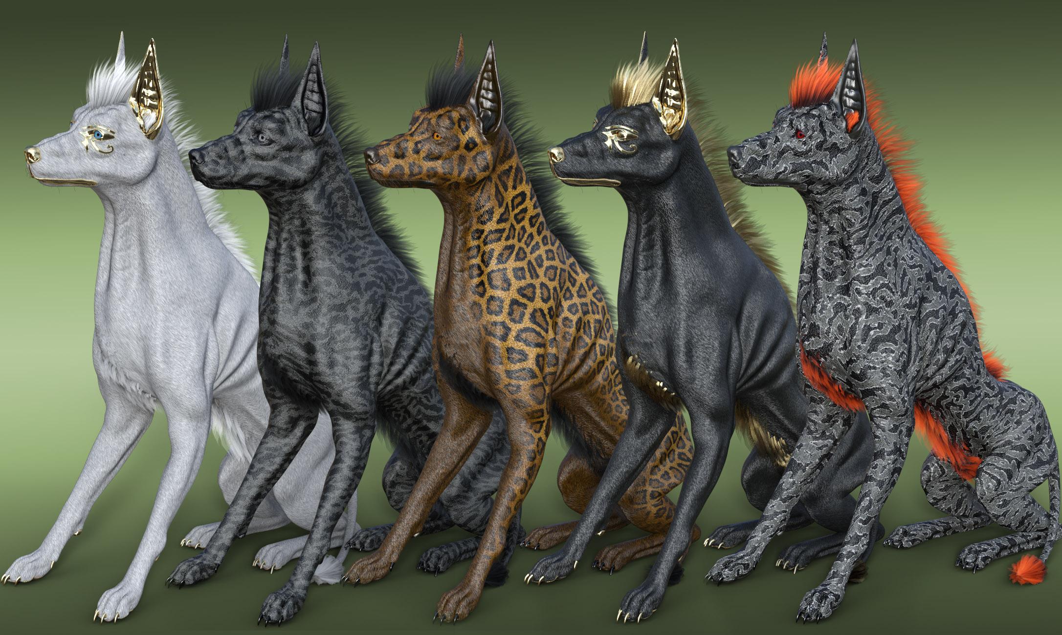 "Anubis Hound for Daz Dog 8" is a great new character for Daz Dog 8. Based on the Egyptian dog of the same name. It comes with 3 character presets Male, Female and Pup so you get the whole family. It has  conforming fiber mesh hair. With beautiful 8K texture sets and 10 different material presets plus 3 mouth, 8 eyes, 11 hair and 4 nail presets. There’s 10 free poses presets with it, plus matching Pup poses. I’ve put 5 wearable presets for the hair so it’s drop and drag! you’ll have a ton of fun with this one. Great for Egyptian scenes and even create your own sci-fi dog. Please note this is an Iray only product, however I had an example render of a conversion using Riversoft Art’s “Iray to 3Delight” script.