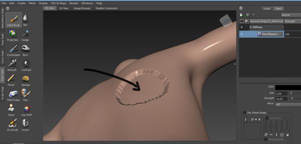 Inoltre ho dimenticato di dire che mi servirebbe per far "apparire" la parte colorata da "sotto" la pelle del modello tramite un morph. Per farti un esempio, il morph nella foto è relativo ad una fullbody suite che sto realizzando. Quel "buco" così come lo vedi va sotto la pelle del personaggio. Se ci piazzo un simbolo egizio sulla texture (una sola in opacity, tutta nera tranne l'area da "sollevare")e durante l'animazione porto il morph da -1 a +1 ecco che ti spunta l'occhio di Ra in fronte senza post produzione e con un effetto decisamente migliore, specie se lo abbini come si deve ad una luce e a delle refraction giuste!