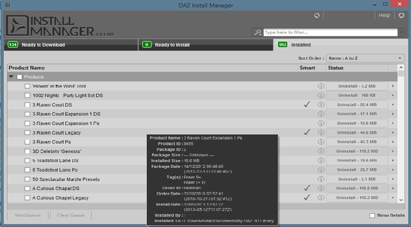 comunque se utilizzi il Daz install manager e vi accedi con il tuo Account appaiono sul lato sx in alto la lista di tutti i files che hai acquistato da installare e aDx quelli già installati, se dalla lista sx scegli un qualsiasi file puoi fare il Download e installarlo in automatico.Puoi selezionarne anche 100 e sono messi tutti in coda per il download e l'installazione,ho utilizzato questo metodo quando ho comprato il PC nuovo (oltre un migliaio di files )