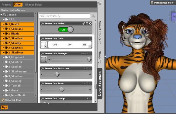 Parla inglese? I have a question for Muscleman. Is TeeGra supposed to use the elite human surface shader/sub surface scattering? I thought she used the default skin and the plastic lighting model. I'm trying to make her skin/fur less shiny. Maybe I should turn down the specular settings.