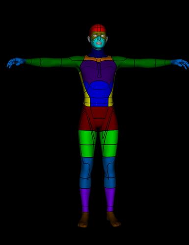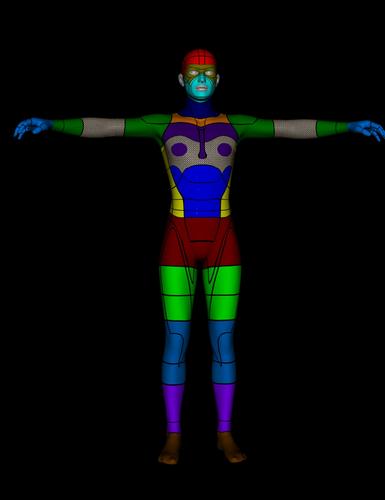 Fin qui c'ero arrivato, il problema è che non riesco ad applicargli una texture che ho colorato io senza rispettare i "settori" in cui è divisa la suit.
