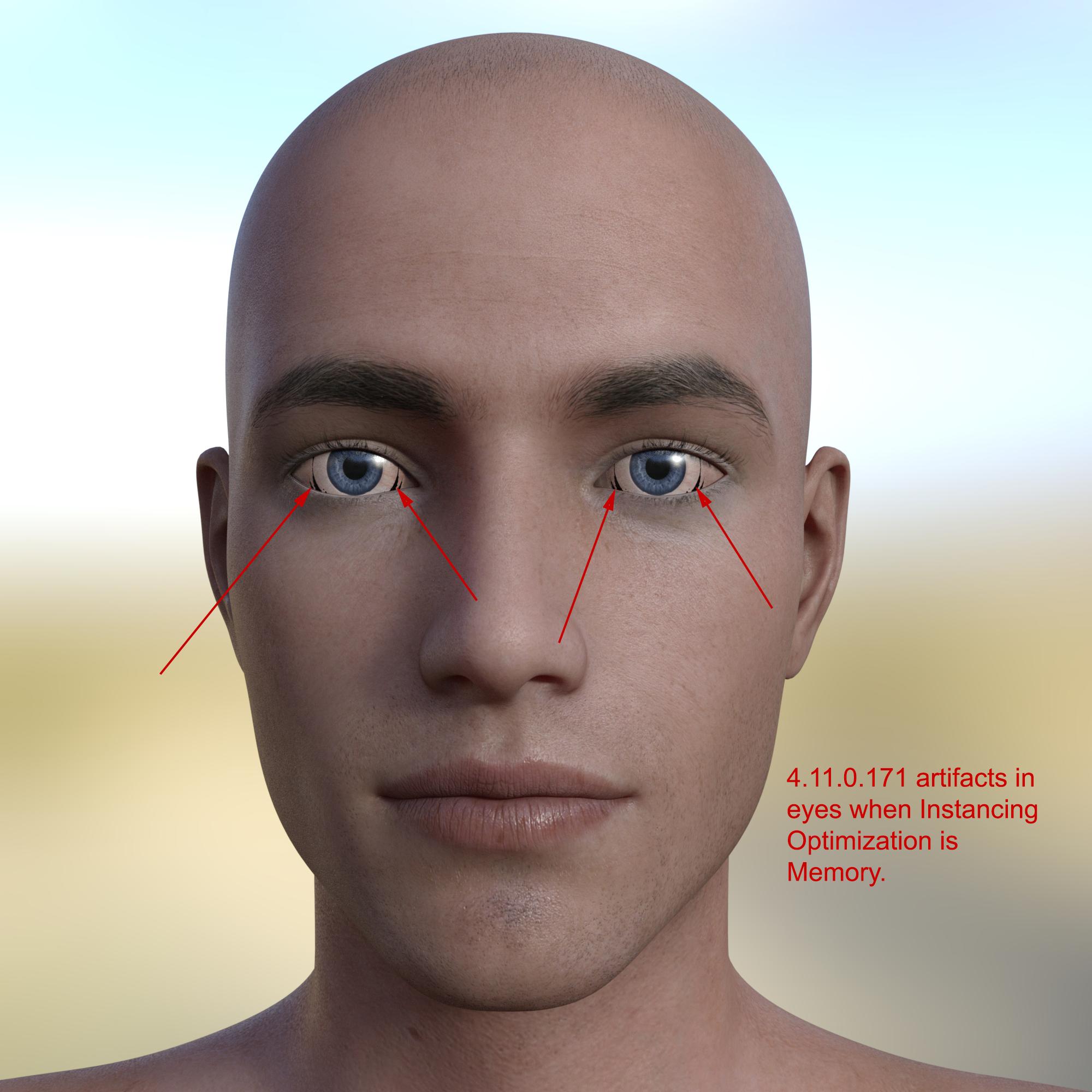 In DS 4.11-0.171 Beta, when I have a character that is translated away from the origin (z=-100 instead of z=0), Instancing Optimization = Memory causes dark artifacts in the character's eyes. Changing the Instancing Optimization to Speed eliminates these artifacts in this scene. I don't even have any instances in this scene, so why does the Instancing Optimization setting have any affect on my render at all?