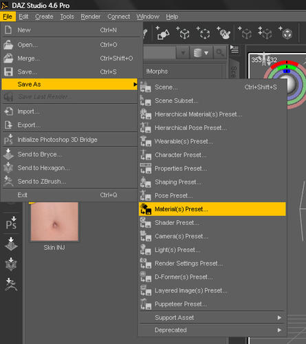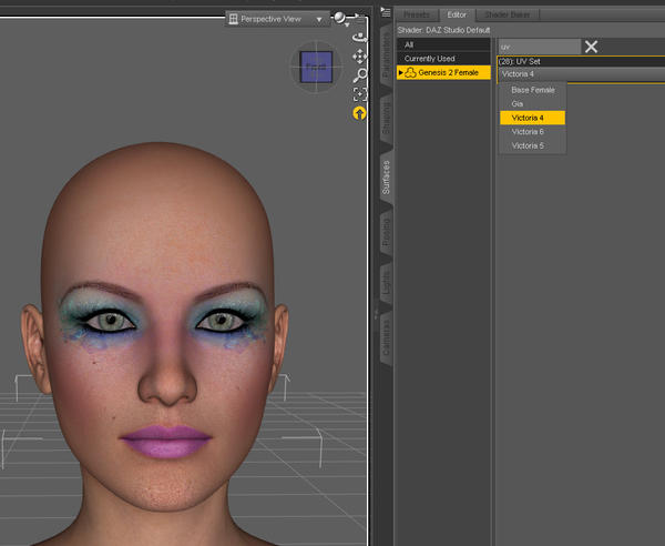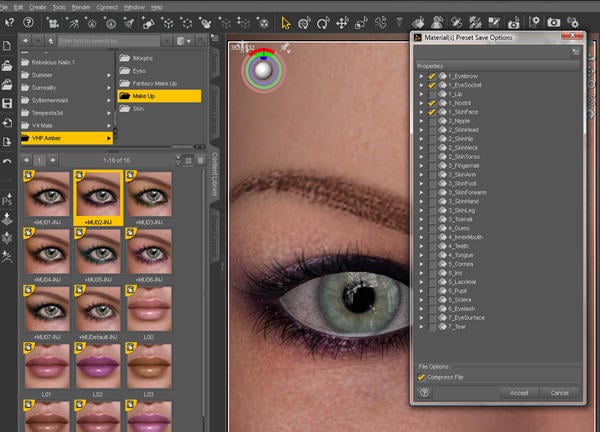 Image 4. Zoom in on altered material to make a nice preset snap shot. Example shows eye make up preset for Amber texture.
