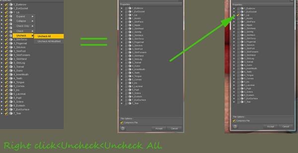 Tip: Right click material options save dialog box with check mark list. A context menu will pop up. Select Uncheck