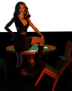 I'm afraid I have that game set so I'm not familiar with the atmosphere prop. On your second image, I think I'd try rotating your figure a little so we get a hint of her profile but can still see the gun behind her back. It's a little disconcerting that I can't see her legs. It's like they have completely disappeared at this angle. One thing you might consider doing is scaling the length of the bar stool legs to keep the pose and be able to have her hand out of the countertop. That way you can keep your basic pose if you like it. The purse also looks sunk into the counter a little so double check that. I'd seriously consider ditching the purse and set up a drink on the bar.