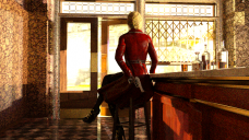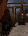 I also have a second render trying for the same style, but something is off and I can't figure out what. (And yes, I'm aware her right hand is embedded in the bar counter, but there's a lot more wrong than that. I can't figure out if it's lighting, or colors, or framing ... yeah, I'm lost on this one).