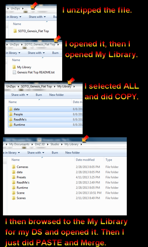 Put the contents of the My Library folder in the zip (not the My Library folder itself) in the folder you use for content - \DAZ 3D\Studio\My Library in your Documents folder is the DS4 default, \My DAZ 3D Library in the Public Documents folder is the DIM default. When asked if you want to merge folders, say yes.