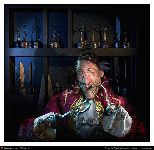hello!... I've always love the peter pan tales, and the myth of the litle boy who didn't want to grow... with his "alter ego", hook; of course the disney movie has been a great moment, but also the spielberg movie, which goes on a more symbolic approach... here, it's just a (I hope) funny picture, with an old hook... modelled and textured in zbrush2, (background modelled in nurbs, by rhino), everything renderd in carrara 4 pro...