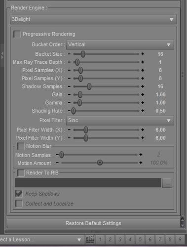 Hey mrgraphix, that is really strange. I can't think of anything in the cameras that would cause that. What lights are you using? Do the eyelashes on the character you are using have ambient turned on or something? Do you have a sample render that might help us troubleshoot it? This would have been my 3Delight render settings. I'll double check on what I had the camera set at.