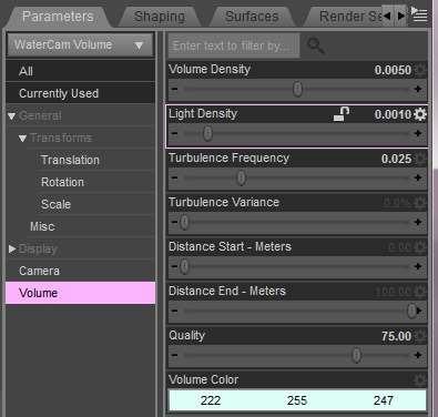 "The underwater light sets work very nicely with the WaterCam, but on the default settings for the WaterCam, the light can be very harsh. For a good starting point to get the colors and the cloudy effect, I recommend changing a few parameters on the cameras. Begin by adjusting the volume density to .0050 and the light density to .0010. You can then experiment with all the many WaterCam parameters to make sure you are getting the effect you want. To save time, always do a smaller test render before doing larger, final renders."