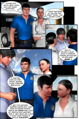 Here's another sample, this one's a page from the second issue. It's been edited, of course, but all 3 figures are Genesis using only the evolution morphs (with a little M4/V4) and default skin textures (Jeremy and Lara) with some tweaks to the shading dials. Now, that's versatile! ;-)