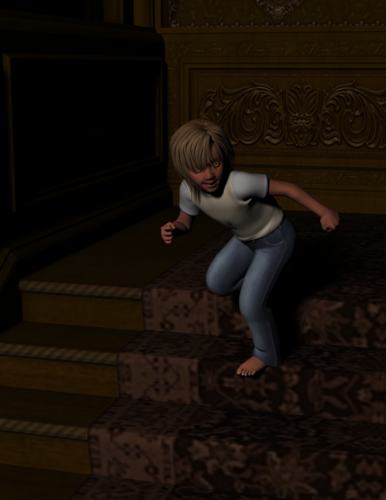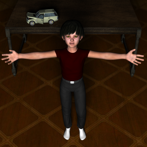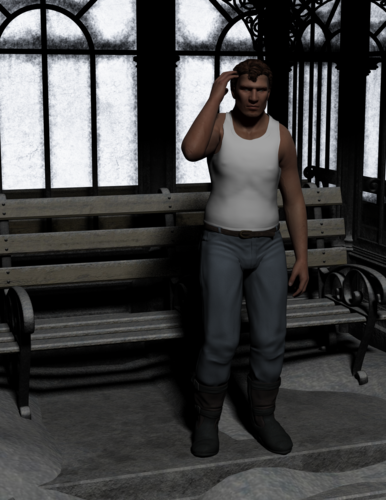 Now that I stopped him for a more static pose, I realize he isn't all that far off from the default appearance of Matt--even though most morphs are dialed quite a bit from zero... I guess, I'd have to either come up with a manual morph in a 3d program or just leave him as is, since he's unique enough by virtue of no one else using Millennium Preschoolers anymore %-P