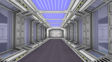 Shot 1: Scoutship approaching station. Shot 2: closer approach, with extended elevator to show where it's going to connect (Don't try this at home! Be sure to be fully docked and that the station's dock has opened before lowering elevator!). Shot 3, ship is docked. Shot 4, view down the hallway from station centre to dock, station door closed. Shot 5, view down the hallway from station centre to dock, station door open. Shot 6, elevator descended to station floor. Shot 7, a little closer shot; someone has kept the captain waiting. Shot 8, closer shot showiing a bit of elevator interior and one of the branchiing hallways. The captain is still not impressed.