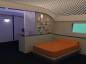 I'd grabbed all the TOS-era rooms I could find at ShareCG and such, and particularly one of them was of Captain Pike's stateroom, and related halways, and another was the regular stateroom set and related halway outside, though I don't remember who made what ones of those.  Maybe one of those was also by Ptrope, but I don't remember.  On the other hand, the regular-series stateroom was notible in that it had a doorway leading to the restroom, and the door itself was specifically named that way... but there was never actually a corresponding restroom made that would be placed out past that door.  I'd been tempted to kitbash one out of the included wall modules and whatnot, and find appropriate-looking fixtures in some other package somewhere, but never got around to it.  The layout and fixtures for this restroom DID appear in that comprehensive-deck-plans book that came out in the 70s, though, so we at least know what shape the room is and what fixtures went where... including, oddly enough, a hot-tub.