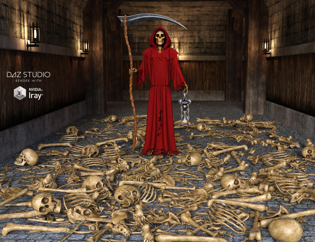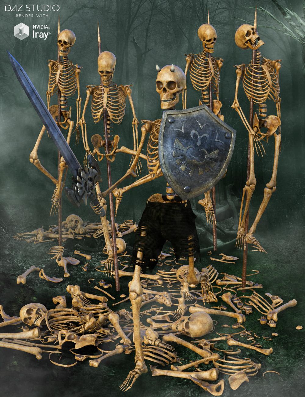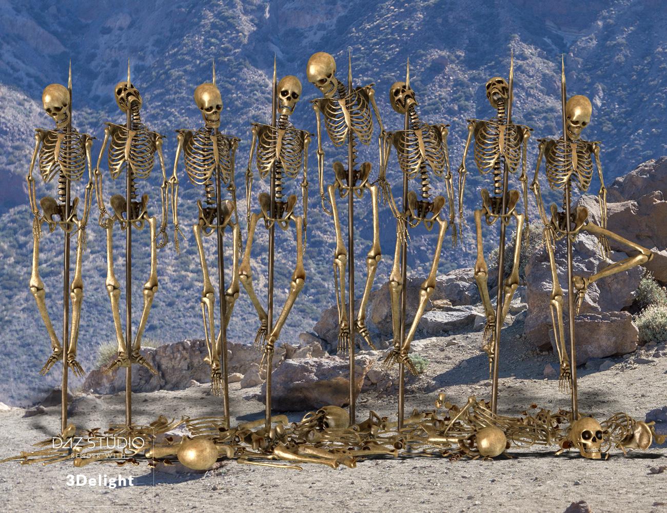 “Mr Scallywags” is a Lowres standalone skeleton by Midnight_stories. It has some great new features. Its base off the Midnight Skeleton, but the poly count has been greatly reduced to 23K, so you are able to do big scenes with it, also the maps have been reduced to 2K, so it’s light on the memory. It has the same compatibility with Genesis 3 Male poses and clothes, Plus 17 bone pile morphs and an animated fall down morph. This would be great for games. It’s been tested with UltraSatter and render very quickly. There are two props a morphing skull and impaling spike. There are 8 premade sub sets made with the impaling spike and a premade scene to get you started. There are three material presets in both Iray and 3Delight. I have also made two Geograft horns sets the will work both on the skull and skeleton. This would be great for all those old vampire and vlad the impaler sets. A must have for all you horror fans!