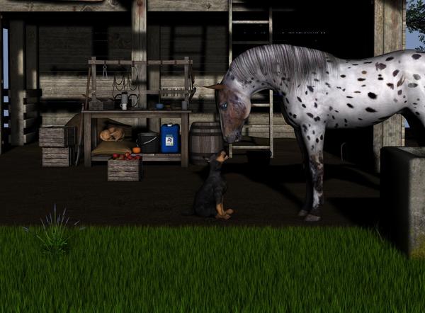 The background "drowns" the subjects a bit; you could turn Depth Of Field on on your camera to get the horse and the puppy to stand out more.