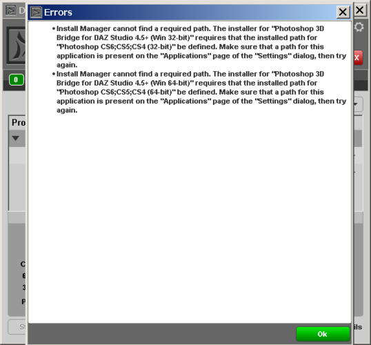 The first error is for installing the Photoshop Bridge for DS4.6. You have to tell DIM where you have PS installed to, if you have it installed. If you don't have a recent version of PS (CS4 or above) the error wont matter. If you do have it, click on the little gear icon in the DIM, and list Photoshop in the Applications tab.