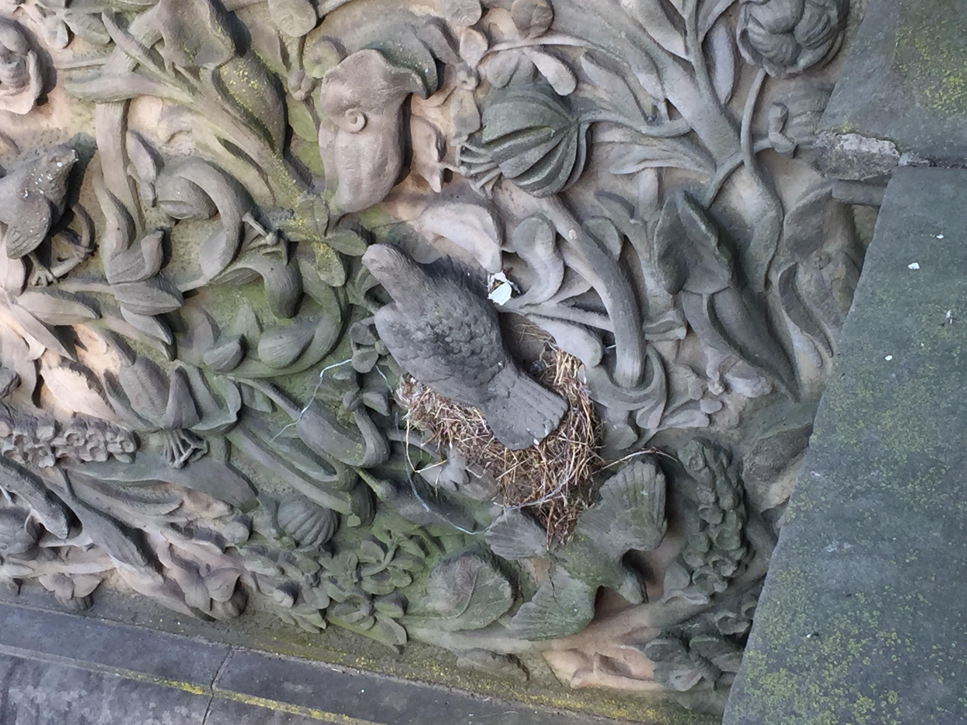 I'm not sure if it's obvious, but a real bird made a nest around a stone bird... If you look on the right side of the fake bird, you can see the spot the real bird was nesting in.
