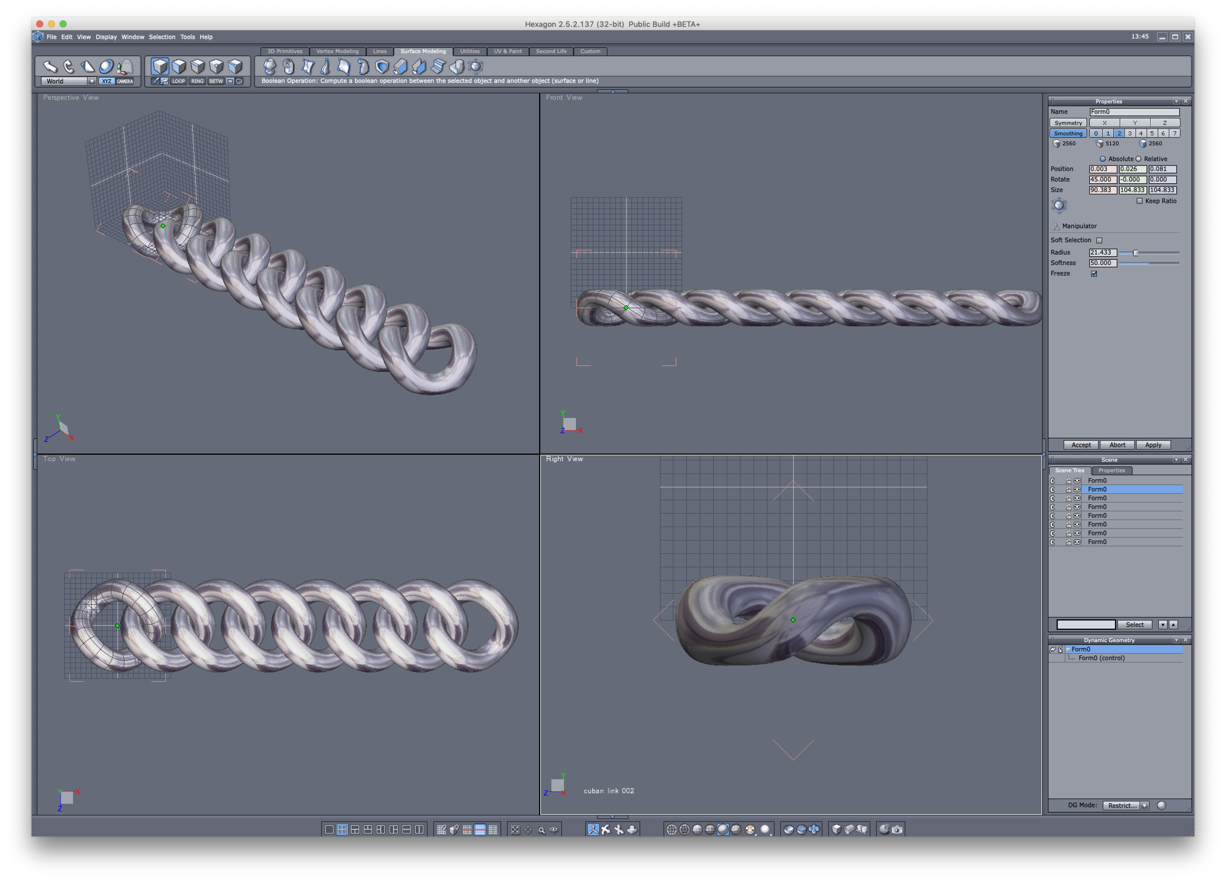 I've watched a couple of YouTube videos on it too. The best one was using Blender, but the concept was the same. He had a couple of tips. First was to start with more of an oval curve to give more room for one link to intersect with the two next to it. The other was to only twist the link about 60 degrees, This keeps it flatter and has a heavier look, but you may have to carve some material out of the underside of the intersections between links so that the meshes aren't passing through each other.