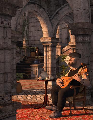 Once I loaded him in the main scene and got him positioned that I realised he was too tall for the focal length of the camera. I couldn't move the cam back so I scaled down Genesis using the Child Morph. Posed him and the lute and rendered.