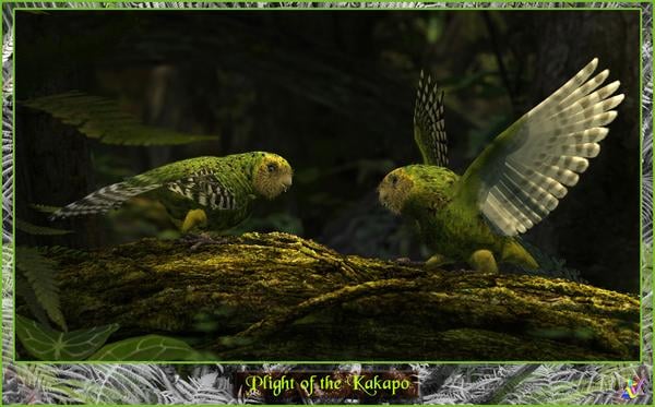 Plight of the Kakapo made in DS3A and a little postwork in Photoshop. This was made for Ken Gilliland's annual bird rendering contest http://www.empken.com/SongbirdReMix/Contest/2013.htm