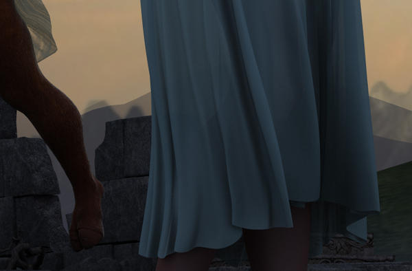 On the other hand, the lights DO let me get a lot closer to the saturated blue shadow look of Maxfield Parrish that I was aiming for. Whereas the original version had around seven lights and never got close to what I really wanted, this was done with just three Ambient Lights... one orange, one blue and one specular only, plus a single orange distant light set low to give a bit of extra modeling and make the gold on the flowers and costumes kick up a bit.