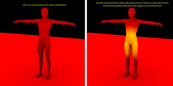 First image has two AALs, the first has a Radius of 0.00 Metres so it illuminates everything, positioned at ground level roughly in the middle of the junction. The second with a radius of 3.00 Metres positioned in the alley to the left of the scene, with a fall off of 0.00% to show the edge of the illumination clearly.