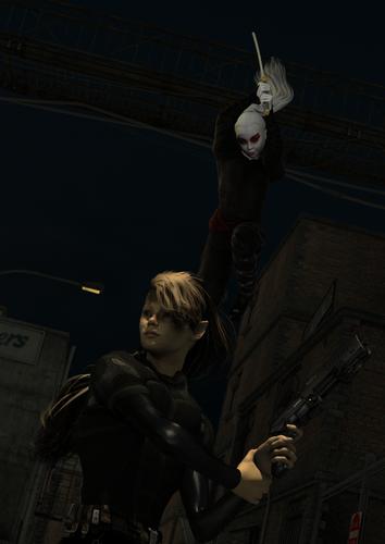 Next have one Advanced ASL aimed at the girl with the clothing flagged off and a second off to the side as a rim light both with teh falloff set to squared, and one over the elf with the gun simulating an streetlight overhead.