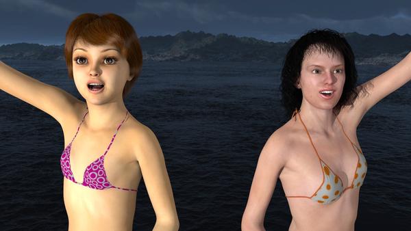 The red head is wearing Garibaldi hair while the brunette is fibermesh (historic curls) with diffuse set to 99% for flagging purposes.