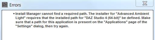 I get an installation error asking for the path to DAZ4, even though the path is defined in the settings, and the Spotlight update installed without a problem.