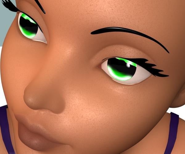 Applying the ApA toon eye present causes the banding effect below. It looks to me like Genesis 2 and/or Girl 6 are using different UV mapping or something so the AoA toon eye texture maps (built for Gen1) don't work on Genesis 2. (I say "or something" because I don't have a firm grasp on how DS shading works). Changing the UV set on Girl 6 from the default 'Girl 6" to "Victoria 4" breaks the skin shaders but doesn't fix the banding problem.