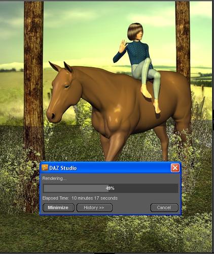 I loaded a horse to see how it would look like in Daz Studio 3. The Millennium Environment takes a while to render with ray traced shadows. I think the grass uses transparencies. I'm glad that I am not using uber area lights or Lux Render.