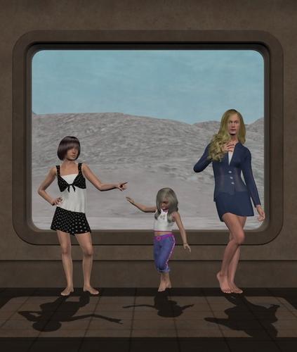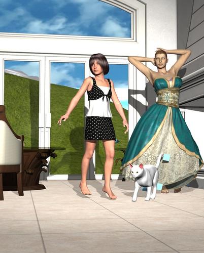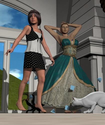 Daz Studio uses 900 MB of memory. Wow. I tried to dress both Genesis 2 figures in a dress but Daz Studio wouldn't render the scene. I had to dress the ladies in pants and shirts.