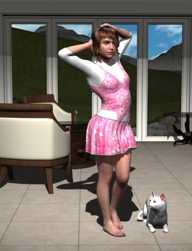 I think she is walking. Her left foot is on the floor. I'll check the scene when I return home though. I should install the advanced spotlight into Daz Studio 4. Then I can import my scene into Studio 4 and use the advanced spotlight. Soft shadows that are generated with regular spotlights take forever to render in Studio 3.