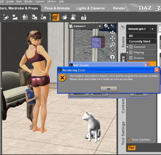 You are right: 3Delight in Daz Studio 4 has hit the memory limit for 32 bit Windows XP. Three GB of random access memory didn't help much. I'll create simple scenes of Genesis 1 and 2 until I buy a new computer.You think you have it bad. I'm working with a machine that only has 2 GB of RAM total. I'm working on a render right now that has been rendering continuously for 155.5 hour so far, and is only 3% done. There's this one small patch which is rendering at a snail's pace, and with each pass, the time it takes to get through this patch has been doubling exponentially. The first 1% took 12 hours, the second took 24, the third 48, and the fourth is still rendering, and has been for 71.5 hours so far. Once it gets through the patch, the rest of the row renders within seconds. This is the longest time it has taken me to render anything to date. Previously, my longest render time was 60 hours total. I'm just hoping that this patch is just that, a small patch, and doesn't run the entire height of the image from top to bottom. And the funny thing about it, is it's a very simple single character render.