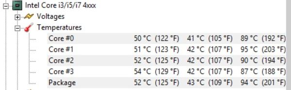 I7 laptop runs hot. Temperatures from left to right are: current, minimum, maximum