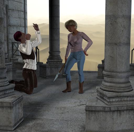 I had to close and open Daz Studio twice before the scene below would render. Ugg. Maybe I should reboot the Windows 8 computer. I finally have a decent render of the lumberjack and Olympia. I'll try rendering the scene with Druid Valley again because Daz Studio became unresponsive and I had to close it forcefully.