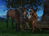 This might be my last render before I go to the operating room.  I stuck the bay horse in my old scene called Druid Valley.  I'll play with the characters' poses and camera angles after the hospital discharges me.