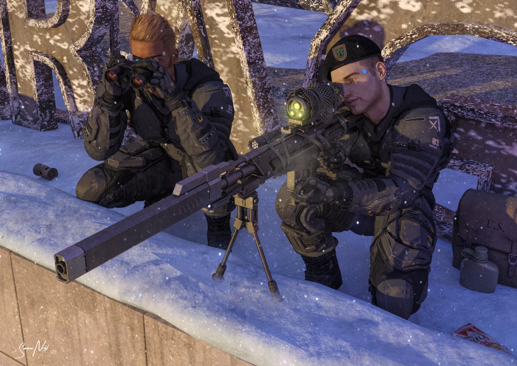 Boyd & Owen get back to work. This old gas station https://www.daz3d.com/earkhams-zworld-winter-gas-station has the best roof I Could find in my runtime.... I looked at many sets and most quite frankly had dated looking textures, or were lacking detail up there. Not this set. Perfect place for a sniper... (Well, if you consider there is no more flamable gas in those tanks).