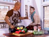 Aww thanks. Thats' about the 11th render of that scene. It was originally in the Manhattan loft, but it just wasnt' coming together. Boyd was holding a grilled cheese, and frying some in the pan, and it just want's working. I put it away for a while, and tried something different and it at last came together!